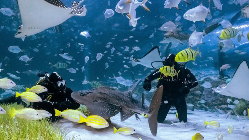 The National Aquarium Abu Dhabi is the largest aquarium in the Middle East and is home to 46,000 animals spread across 10 zones. The aquarium houses more than 200 sharks and rays, representing 25 different species. All of the animals are cared for by a team of 80 sea-life experts.